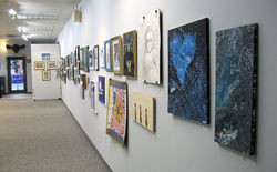For the third year, we asked artists "What does 'blue' mean to you?" They made work that shows it -- the color blue, Blues music, feeling blue, blue skies, anything blue. The show includes work by 50 artists from nine counties in central Pennsylvania; their ages range from 3 to somewhere north of 70, and they brought paintings, drawings, and photographs in two dimensions; ceramics, glass, jewelry, woodcarvings, a quilt, and other mixed media in three dimensions. At least four of the adults have never shown here before, so we continue to attract new artists, show after show -- very exciting for us.